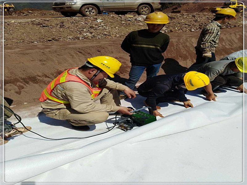 根據(jù)技術(shù)要求,土工膜之間連接不允許出現(xiàn)“十”接頭,多幅PE膜之間采用“丁”字型接頭。施工時(shí)采用普通焊接方式,焊接結(jié)束后對(duì)“丁”字型接頭部位采用擠壓焊接進(jìn)行擠壓,以便進(jìn)行充氣檢測(cè)。然后,采用電火花對(duì)擠壓部位進(jìn)行檢測(cè)。采用真空檢測(cè),該檢測(cè)方式不可或缺。檢測(cè)合格后,對(duì)“丁”字型接頭部位采用母材加KS膠進(jìn)行補(bǔ)疤。